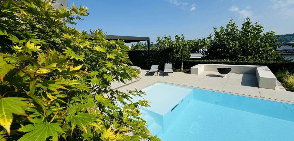 Davor rund 150 m² gepflegte Rasenfläche, gebettet zwischen blühenden Beeten, rotem Ahorn und der stillen Weite des Bodensees. Diese Gartenanlage ist nicht nur schön – sie ist einzigartig. Am Bodensee gibt es kaum Ferienwohnungen mit einer so großzügigen, sonnigen und ebenen Grünfläche, die an einen modernen 15m Infinity Pool angrenzen. Meist bleiben Außenbereiche klein oder gar rein funktional. Nicht so im Paradisio – hier bekommst du Frei-Raum.